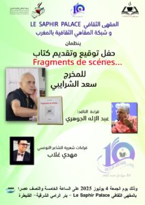 استمرارا لأنشطتها الثقافية والإشعاعية لهذا الموسم ، احتفالا بمرور عشر سنوات على تأسيسها ( 2015- 2025 ) ، تنظم شبكة المقاهي الثقافية بالمغرب ، والمقهى الثقافي “لوسافير بلاص ” حفل تقديم وتوقيع كتاب