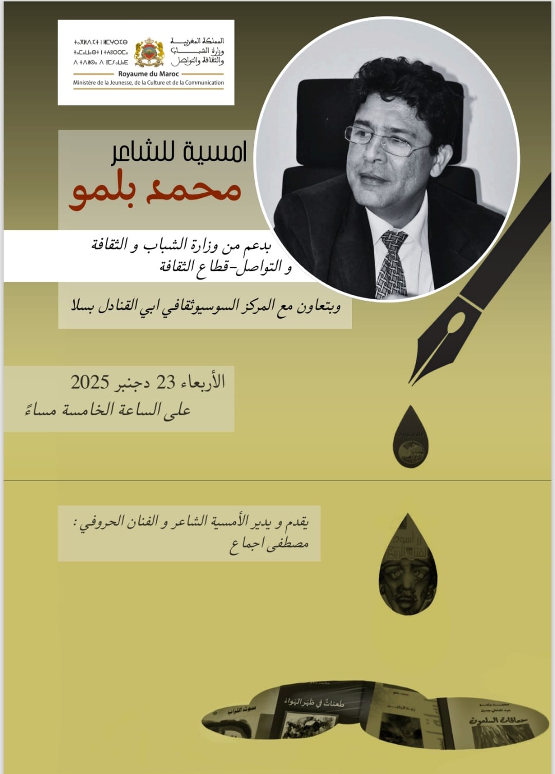 وتتواصل رحلة الشعر بمدينة سلا في موعد ثان يوم الثلاثاء 23 دجنبر 2025 بالمركز السوسيوثقافي أبي القناديل، في الخامسة مساء، حيث يتجدد اللقاء مع قصائد بلمو، في أمسية يديرها ويقدمها الشاعر والفنان الحروفي مصطفى اجماع.