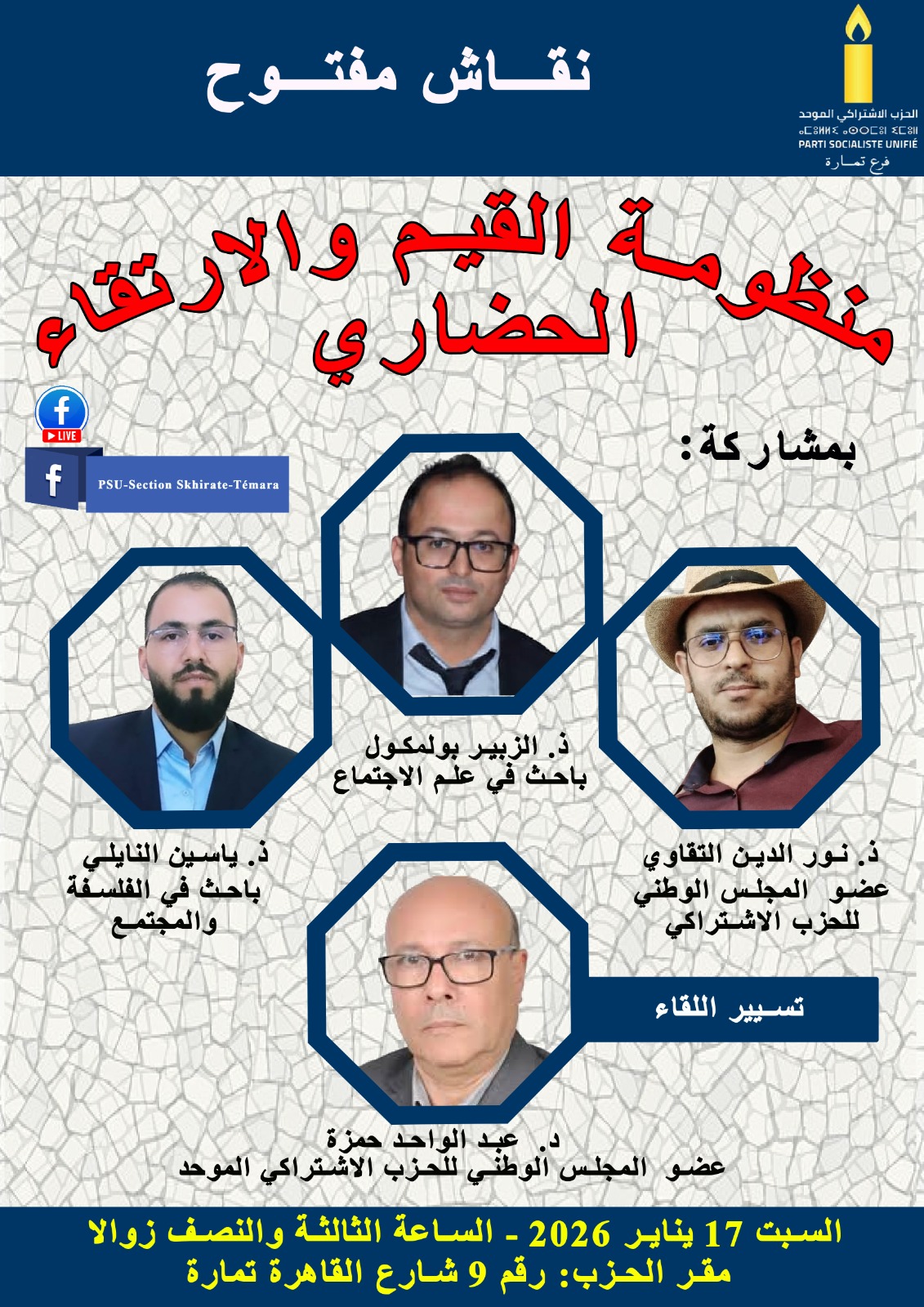 تنظم الكتابة المحلية للحزب الاشتراكي الموحد بتمارة، بشراكة مع عدد من الفاعلين الفكريين والسياسيين، لقاءً فكريًا مفتوحًا تحت عنوان “منظومة القيم والارتقاء الحضاري”، وذلك يوم السبت 17 يناير 2026، على الساعة الثالثة والنصف زوالًا، بمقر حزب الإشتراكي الموحد الكائن بشارع القاهرة رقم 9 بمدينة تمارة.