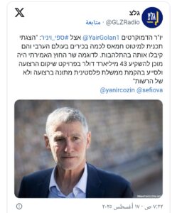 كشف رئيس حزب الديمقراطيين في “إسرائيل” يائير غولان، أنه جرى عرض خطة لإسقاط حركة حماس على عدد من كبار المسؤولين في العالم العربي، مؤكدا أن العديد منهم قد “استقبلوها بحماسة”.